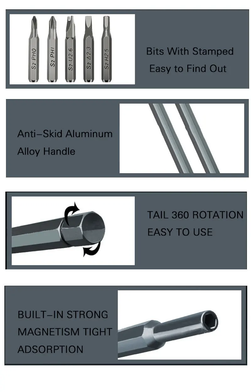 1,62 PCes parafusam bocados e uma chave de fenda, em uma caixa plástica do pacote com magnetismo. 2. Fácil de operar, durável e portátil.